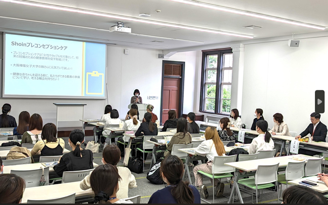 2024年度は3回の学内講演会を予定しており、2024年5月30日に第1回の講演会「プレコンセプションケアってなに?!」が開催されました。この講演会は大阪樟蔭女子大学と東大阪市保健所、こうむら女性クリニックの甲村弘子医師(元大阪樟蔭女子大学教授)、大塚製薬株式会社との共同で企画されたものです。