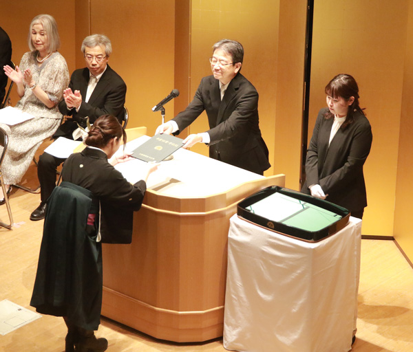 2024.9.17 令和6年度春期学位授与式が挙行されました 9月17日(火)本学円形ホールにて令和6年度春期学位授与式を執り行いました。学芸学部16名、児童教育学部1名、健康栄養学部3名の 卒業生に学位記を授与、式典では学長が式辞を述べられました。閉式後は教員、友人らと記念撮影をするなど、別れを惜しむ光景が見られました。最後になりましたが、卒業生の皆様、ご卒業おめでとうございます。 一覧へ戻る