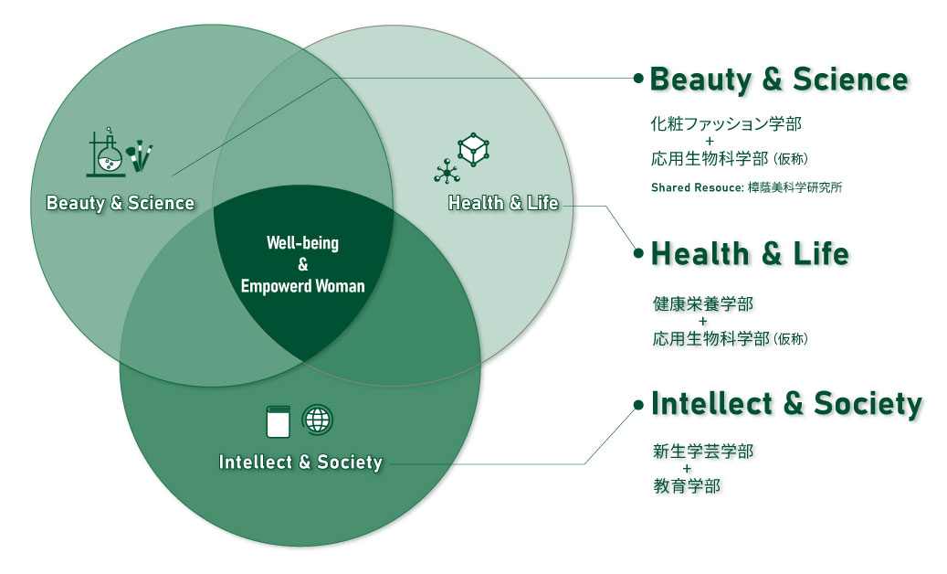 応用生物科学部(仮称)は、建学の精神に基づくリベラルアーツ教育を基盤に、生命科学の専門知識と実践力を修得し、美(コスメティック)・食(フード)・健康分野を通して、人々のウェルビーイング向上と社会課題の解決に貢献できる人材を育成します。