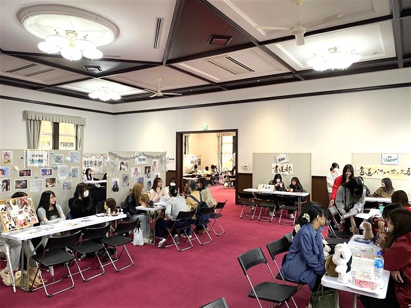 会場である記念館2階には各クラブ・同好会のブースが並び、新入生たちは興味のあるブースを訪れて、先輩たちの話を熱心に聞き入ってました。